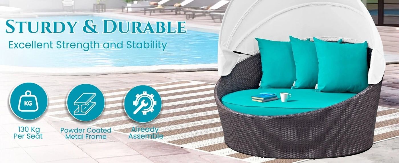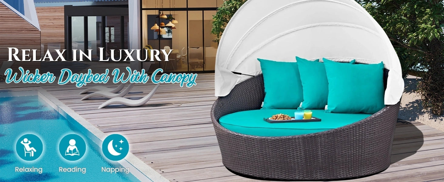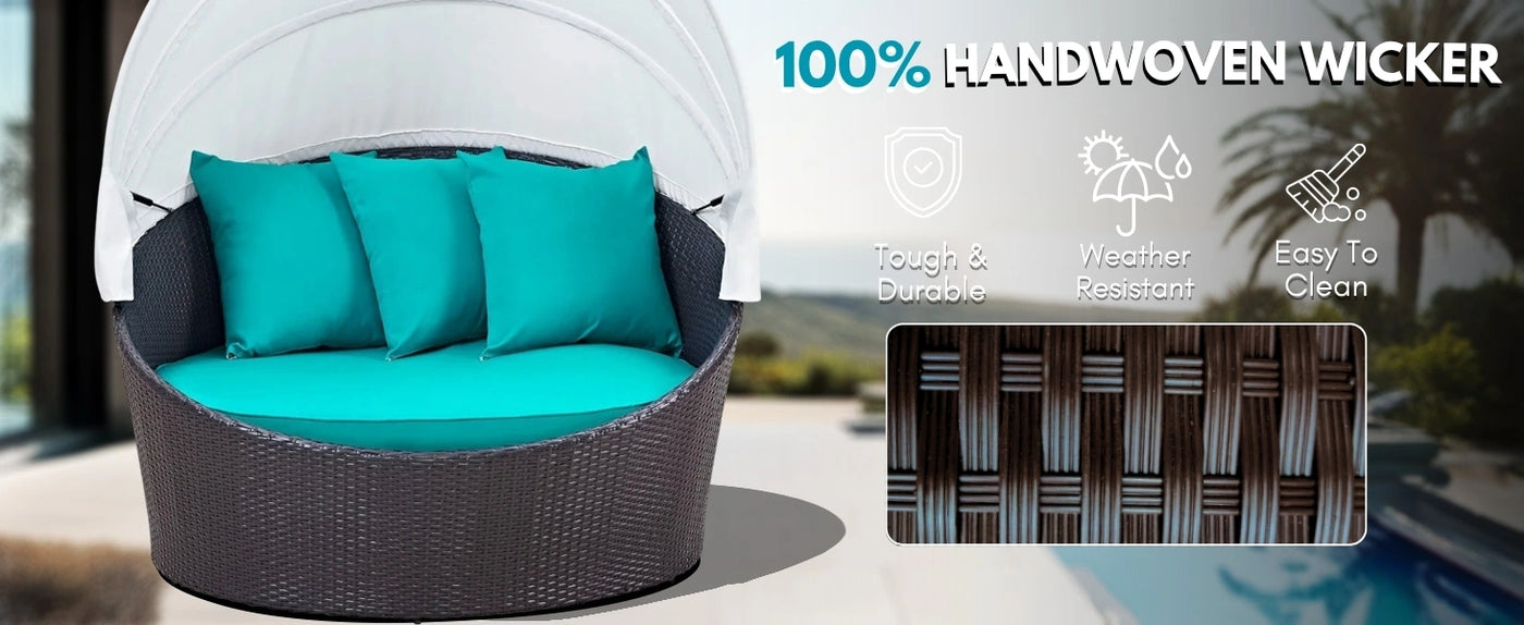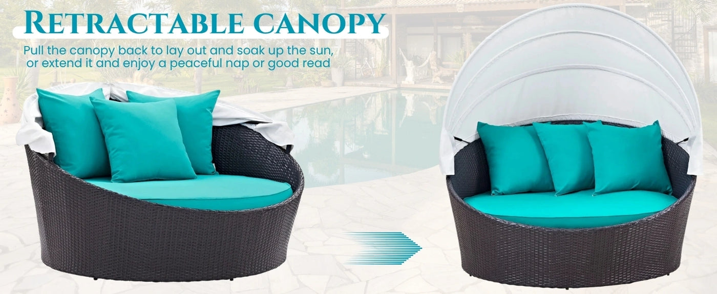Transform your outdoor space into a luxurious retreat with this Outdoor Rattan Wicker Patio Daybed with Canopy. Crafted from durable, weather-resistant rattan and supported by a rustproof powder-coated metal frame, this stylish daybed is built to withstand sun, rain, and daily wear perfect for year-round use in your poolside, garden, deck, or lawn. Designed for comfort and relaxation, it features thick, high-density cushions with removable, washable covers for easy maintenance. The retractable canopy provides adjustable shade and UV protection, allowing you to relax in comfort whether you're soaking up the sun or enjoying a shaded nap. With its elegant curved design and spacious seating, this daybed offers a resort-like experience at home. Ideal for lounging, reading, or entertaining guests outdoors, it’s the ultimate blend of functionality and style.