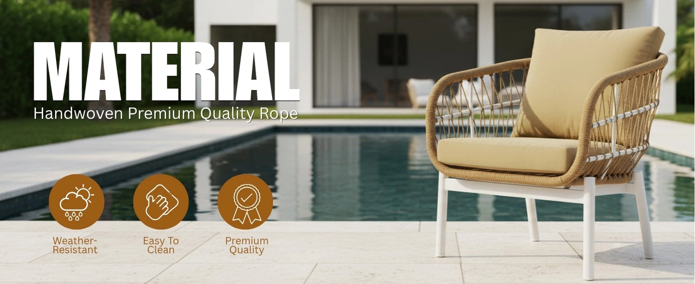 1. Rope Furniture - Clean with mild soap and water, avoid excess moisture, and cover when not in use to prevent wear from sun and rain.