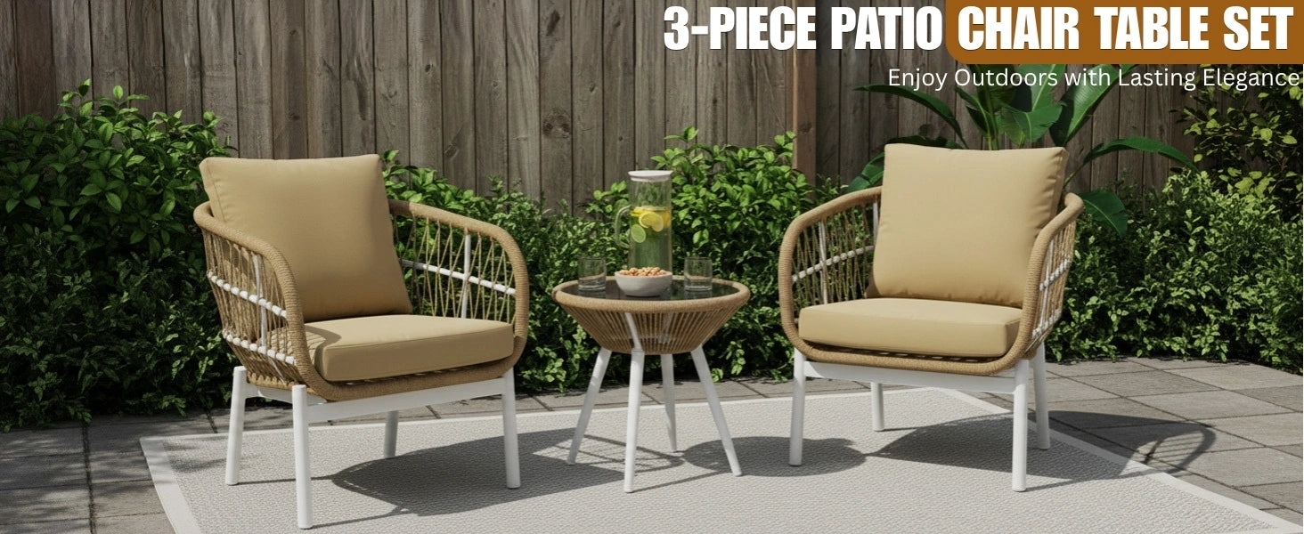 Upgrade your outdoor living experience with this stylish 3 Piece Patio Rope Set, thoughtfully designed to bring modern elegance, comfort, and functionality to your balcony, garden, or patio. Featuring two ergonomically designed cushioned chairs and a sleek glass-top table, this set is the perfect blend of style and relaxation for morning coffees, evening chats, or weekend lounging. Crafted with a beautifully hand-woven rope design, the chairs boast a contemporary twist with an airy, breathable weave that not only adds visual appeal but ensures superior comfort. The color scheme offers a fresh, neutral aesthetic that complements any outdoor décor whether minimalist or vibrant. The chairs are paired with plush, water-resistant cushions that invite you to sit back and unwind, while the durable fabric ensures easy cleaning and long-lasting use. The compact yet sturdy glass-top table provides a convenient space for drinks, books, or décor, and its clear tempered glass adds a modern touch while remaining easy to maintain. Whether placed on a balcony, in a cozy garden corner, or on a sunlit patio, this versatile set offers lightweight portability, rust-resistant metal framing, and all-weather durability perfect for year-round use.