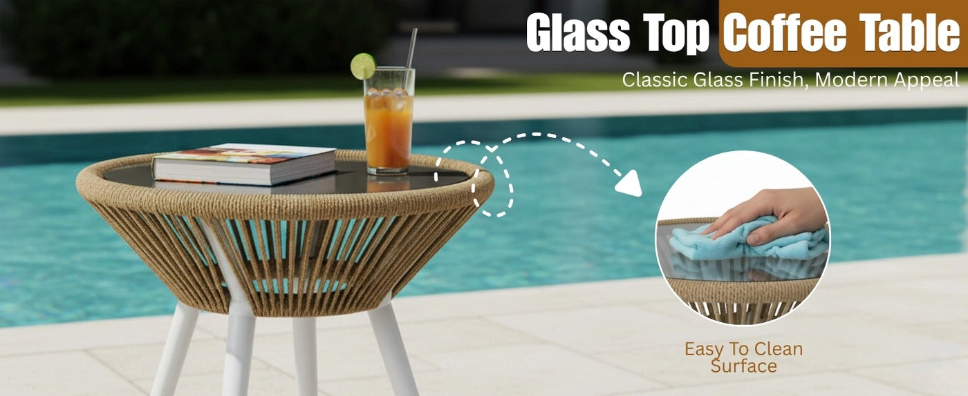 - Glass-Top Table : Sleek and stable center table with a durable glass top, ideal for holding drinks, snacks, or decorative items during relaxing outdoor moments.