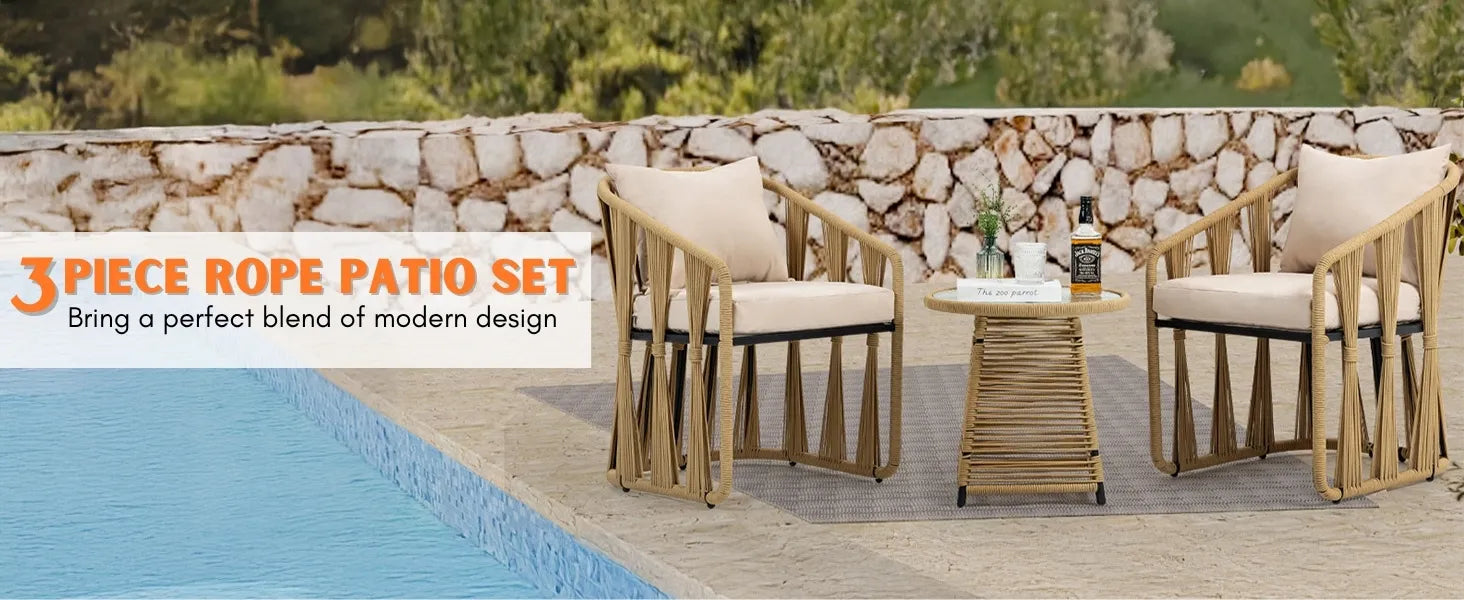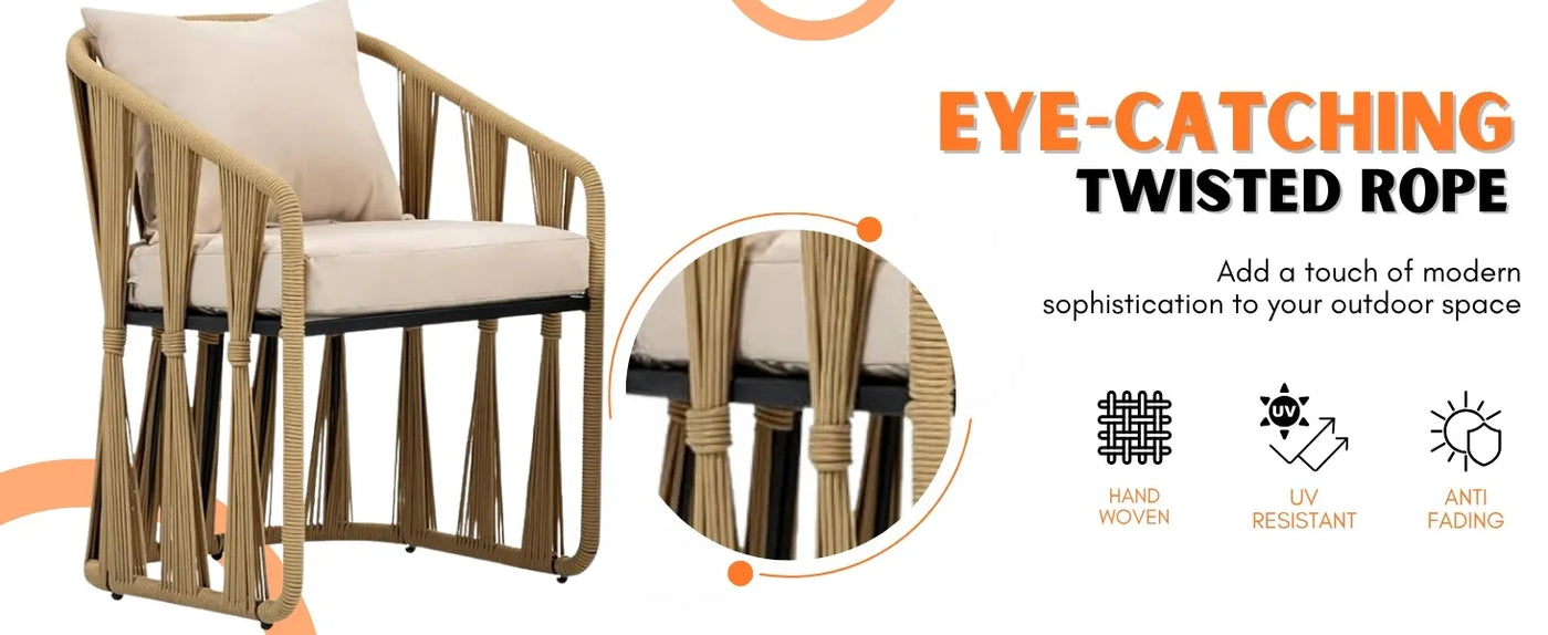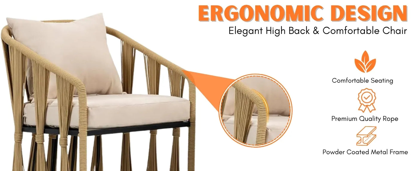 Bring elegance, comfort, and charm to your outdoor space with this stylish 3-Piece Outdoor Rope Patio Bistro Set. Expertly designed to blend modern aesthetics with functional durability, this set features two ergonomically curved chairs crafted with high-quality woven rope detailing, perfectly complemented by soft, cream-colored cushions that offer plush support for long hours of relaxation. The neutral beige and cream tones add a touch of warmth and sophistication, making it an ideal addition to any garden, deck, lawn, poolside, porch, or balcony. The set includes a sleek and sturdy round table with a tempered glass top both stylish and practical providing a stable surface for your morning coffee, evening drinks, or light meals. The powder-coated metal frame ensures long-lasting performance and is resistant to rust and wear, making this bistro set perfect for all-weather use. The handwoven rope is UV-resistant, breathable, and easy to maintain, ensuring your set stays beautiful season after season.