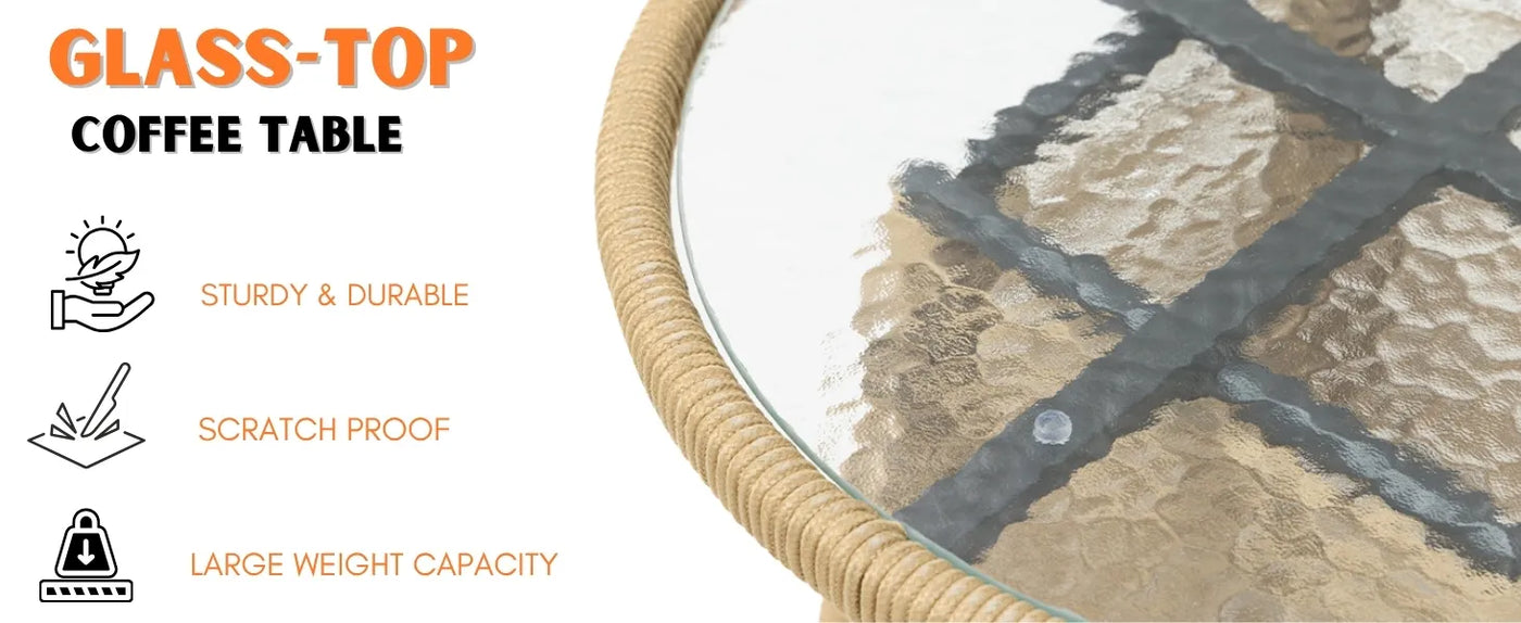 • Glass-Top Table : Sleek and sturdy, the round glass tabletop offers a stable surface that’s easy to clean ideal for morning coffee or evening drinks.