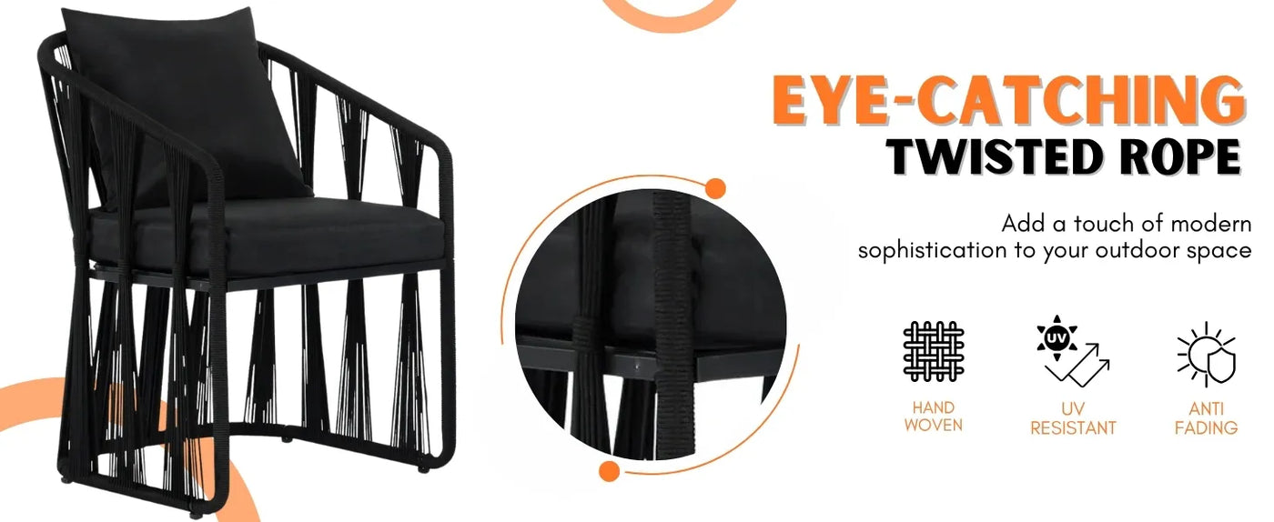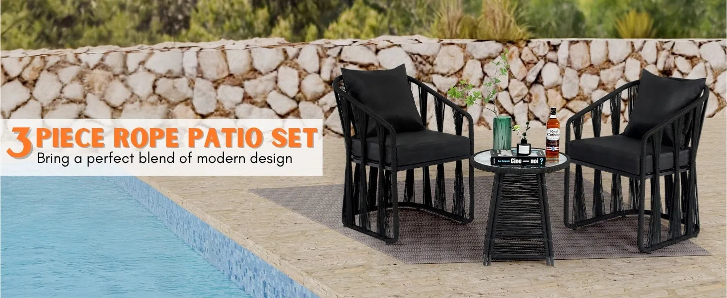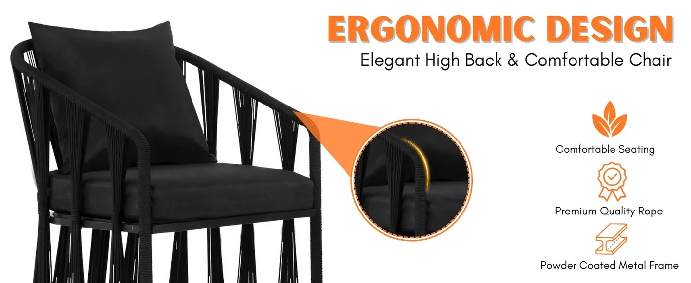 Bring elegance, comfort, and charm to your outdoor space with this stylish 3-Piece Outdoor Rope Patio Bistro Set. Expertly designed to blend modern aesthetics with functional durability, this set features two ergonomically curved chairs crafted with high-quality woven rope detailing, perfectly complemented by soft, black-colored cushions that offer plush support for long hours of relaxation. The neutral black adds a touch of warmth and sophistication, making it an ideal addition to any garden, deck, lawn, poolside, porch, or balcony. The set includes a sleek and sturdy round table with a glass top both stylish and practical providing a stable surface for your morning coffee, evening drinks, or light meals. The powder-coated metal frame ensures long-lasting performance and is resistant to rust and wear, making this bistro set perfect for all-weather use. The handwoven rope is UV-resistant, breathable, and easy to maintain, ensuring your set stays beautiful season after season.
