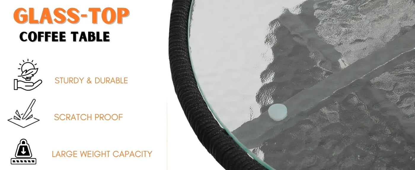 • Glass-Top Table : Sleek and sturdy, the round glass tabletop offers a stable surface that’s easy to clean ideal for morning coffee or evening drinks.