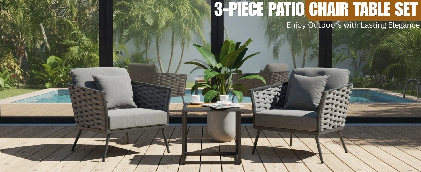 Outdoor Rope 3-Piece Patio Set With Wooden Top Table