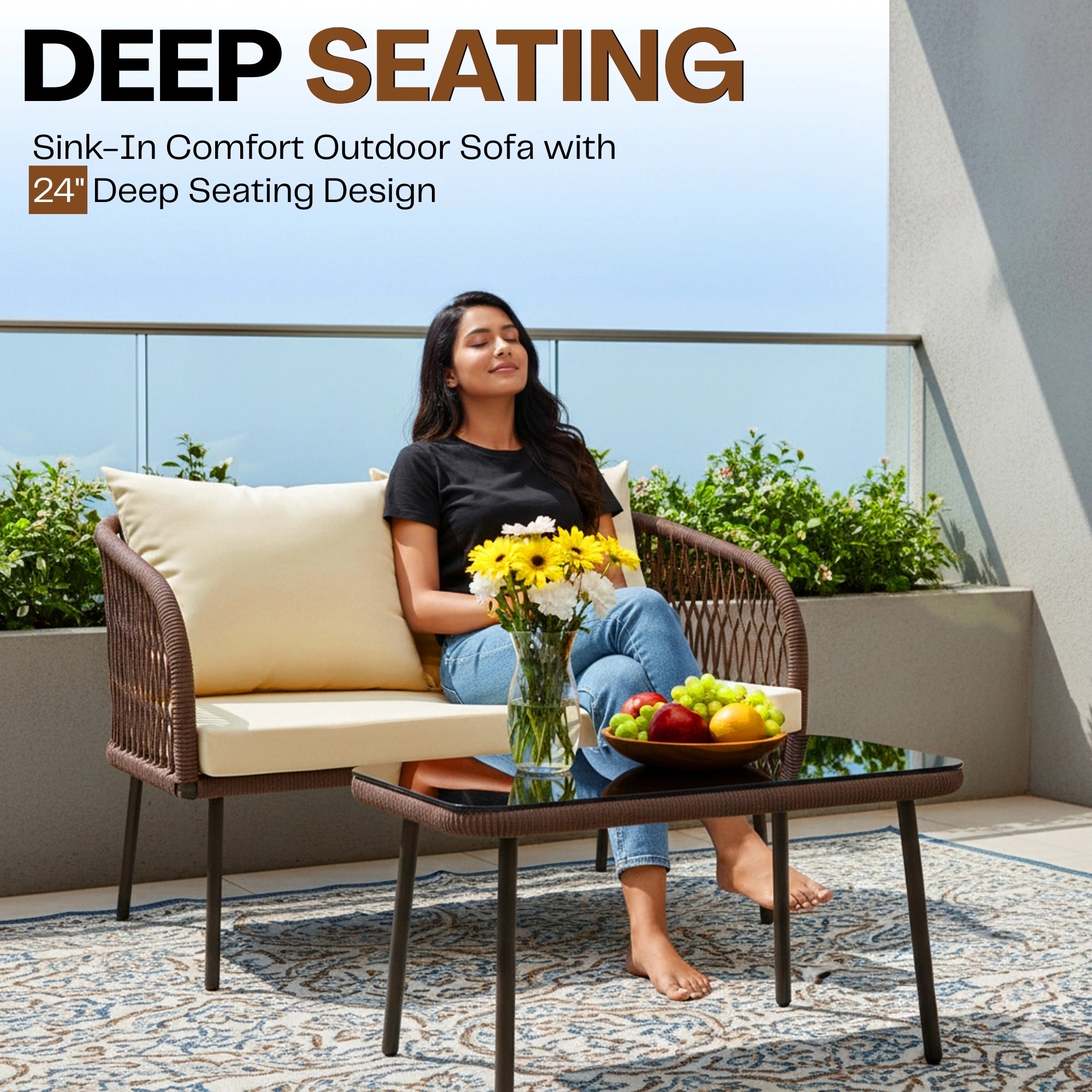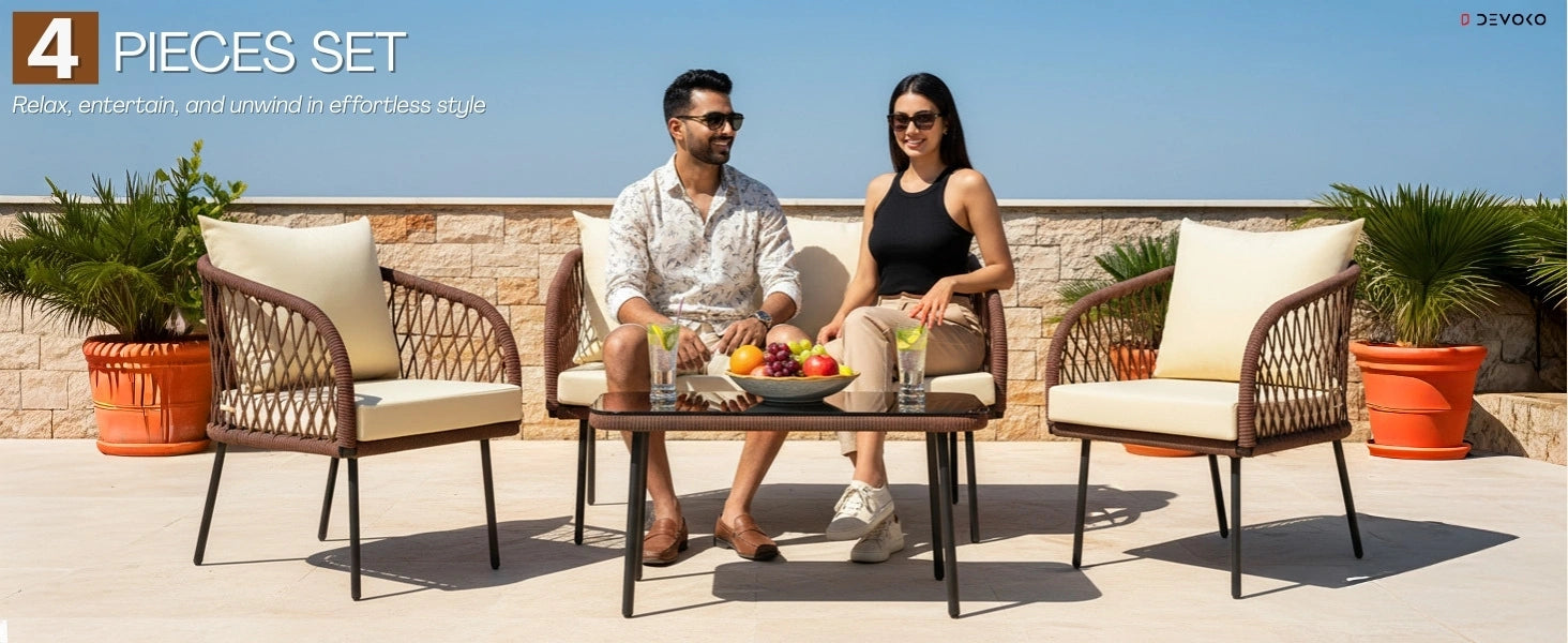 Transform your outdoor living space with the DEVOKO Outdoor Rope 4-Seater Sofa Set, thoughtfully designed to blend modern elegance with everyday comfort. Crafted with a durable powder-coated metal frame and breathable handwoven rope, this premium patio furniture set offers long-lasting performance in all weather conditions. The water-repellent, plush cushions ensure relaxed seating, while the elegant glass-top center table adds both style and functionality. Ideal for gardens, patios, pool decks, terraces, and balconies, this versatile outdoor sofa set delivers space-smart seating, lightweight strength, and contemporary charm for outdoor entertaining or peaceful relaxation.