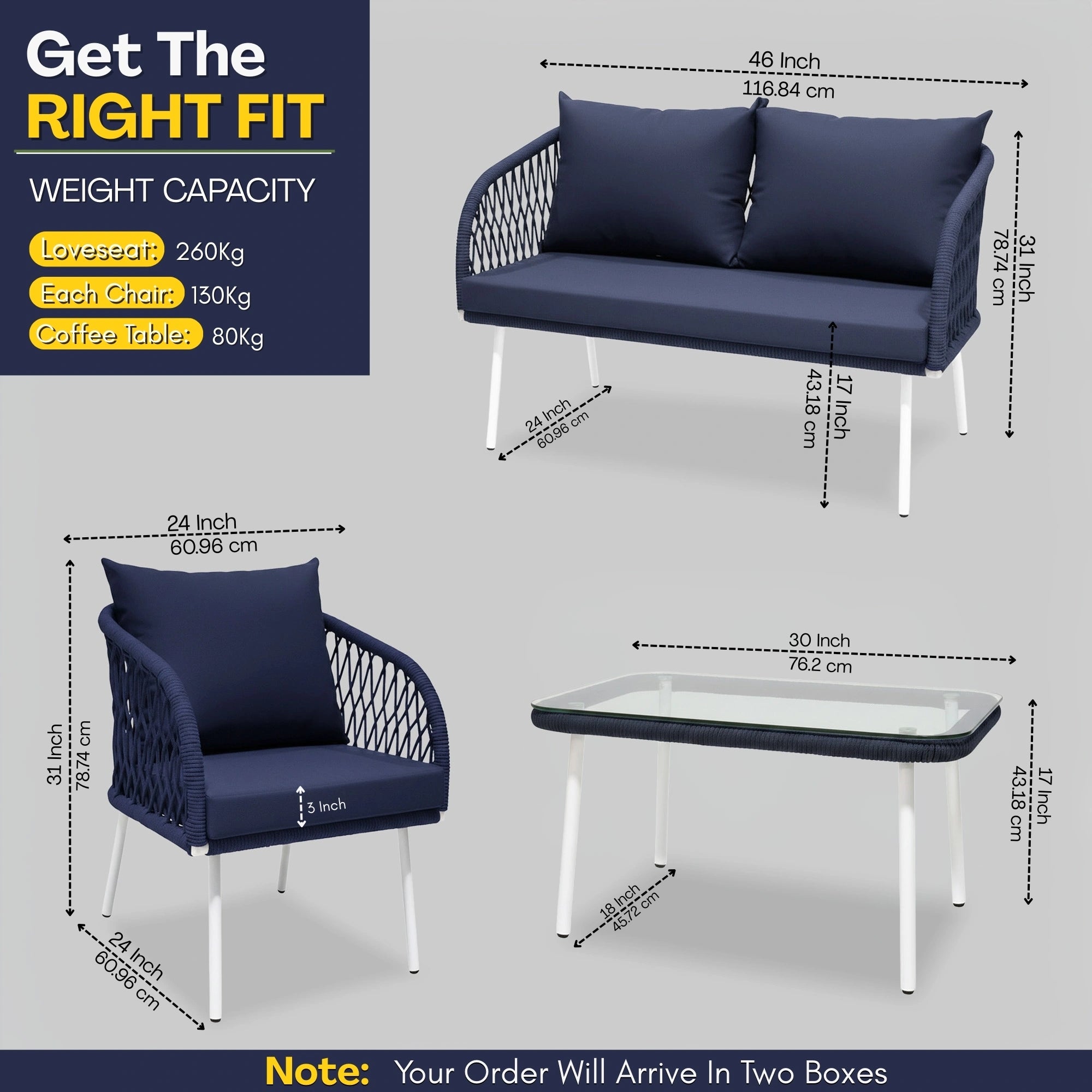 - Double Seater Dimensions: 46"Lx24"Wx31"H