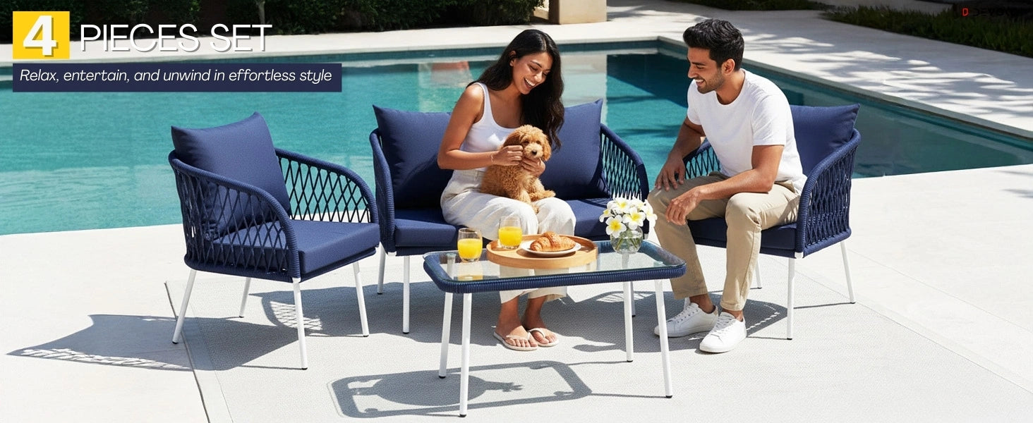 Outdoor Rope 4-Seater Sofa Set with Glass Top Table (Navy-blue & Royal Blue)