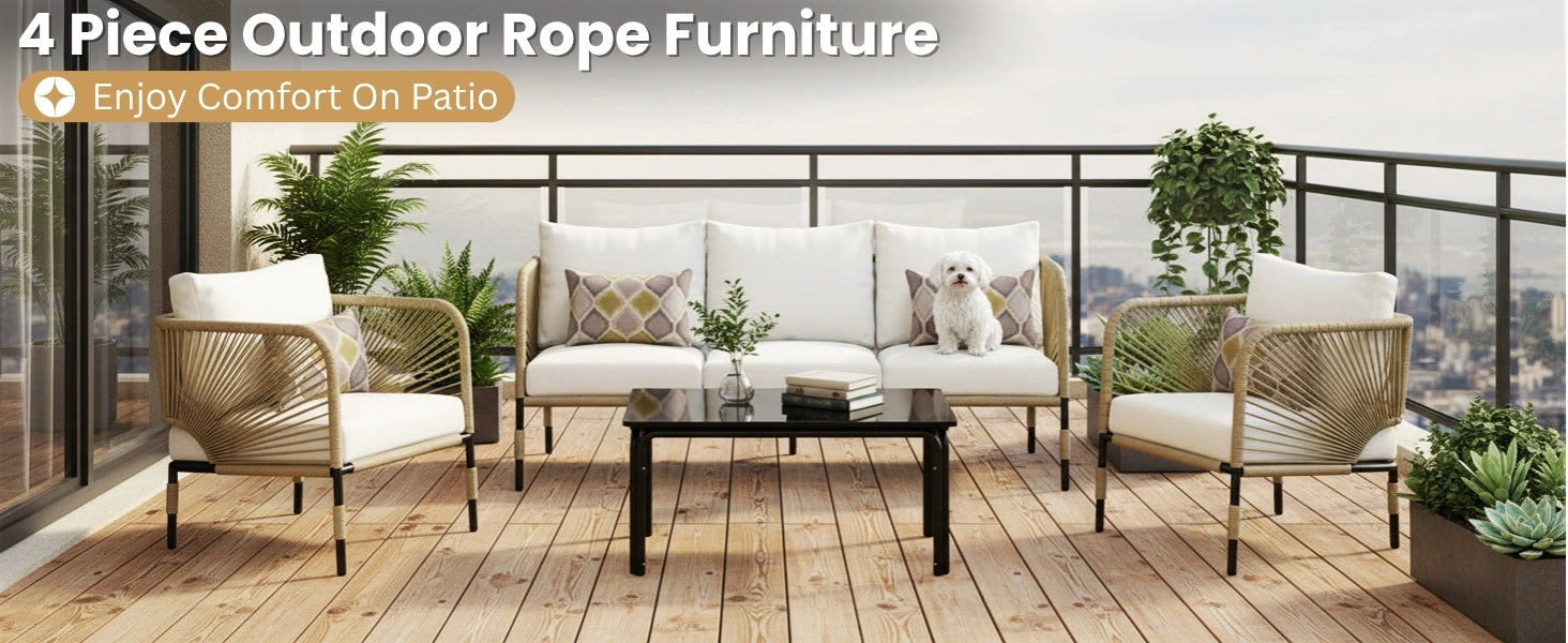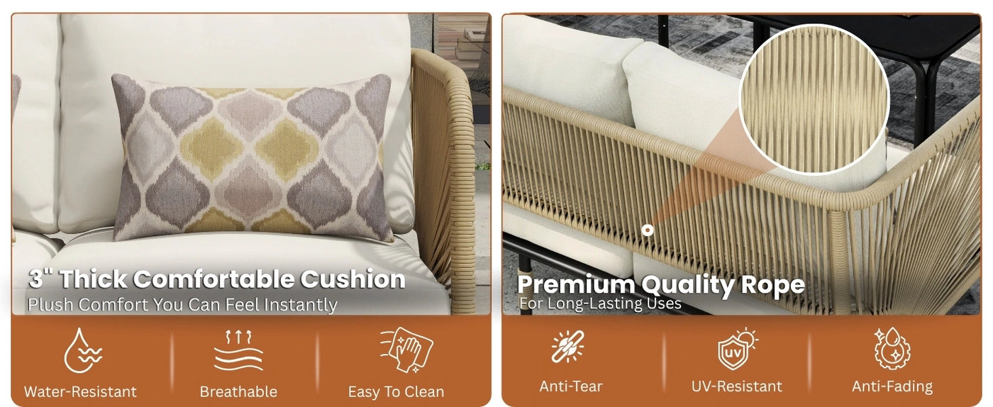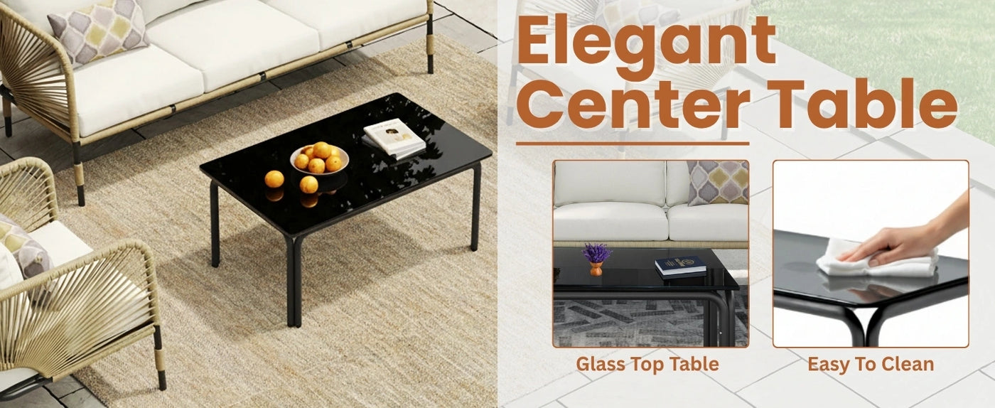 Transform your outdoor space into a stylish and relaxing retreat with this elegantly crafted 5-seater patio rope sofa set, complete with a glass top coffee table. Designed for gardens, backyards, terraces, and patios, this conversation set brings together modern design, outdoor durability, and superior comfort to enhance your lifestyle under the open sky. Built with a strong powder-coated metal frame, the set offers excellent stability and long-lasting performance. The seats are wrapped in handwoven weather-resistant rope, giving a contemporary look while withstanding sun, rain, and daily wear. Plush, foam-padded cushions provide soft, ergonomic support for hours of relaxed lounging, and the removable, washable covers make maintenance effortless. At the center, the sleek glass top coffee table offers a spacious surface for your snacks, drinks, or décor items, while its stable base ensures safety and durability. Whether you’re hosting evening conversations, enjoying morning coffee, or unwinding with a book, this 5-seater set offers the perfect space to connect and relax.