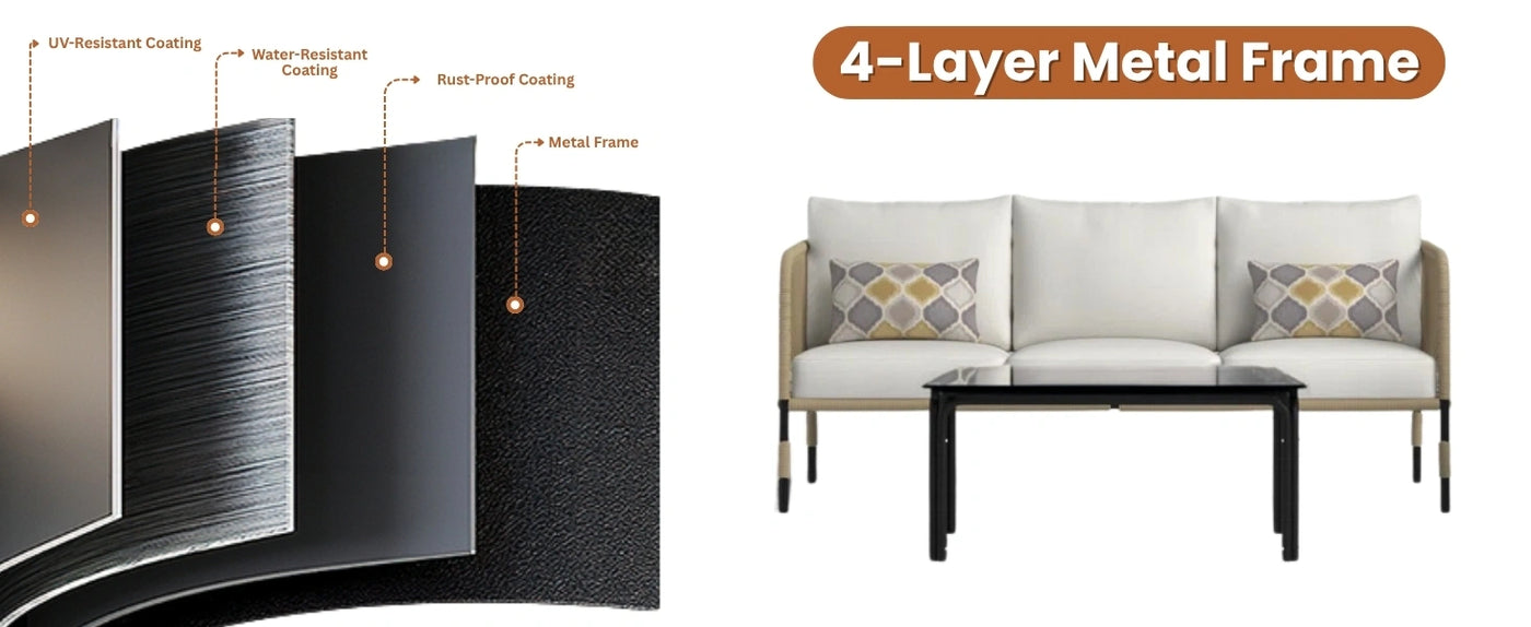 - Materials : Powder-coated metal frame for rust-resistance and strength. Foam-filled with zipper covers that are weather-resistant and breathable. Rope is treated to resist fading, fraying, and mold/mildew from moisture and sun exposure.