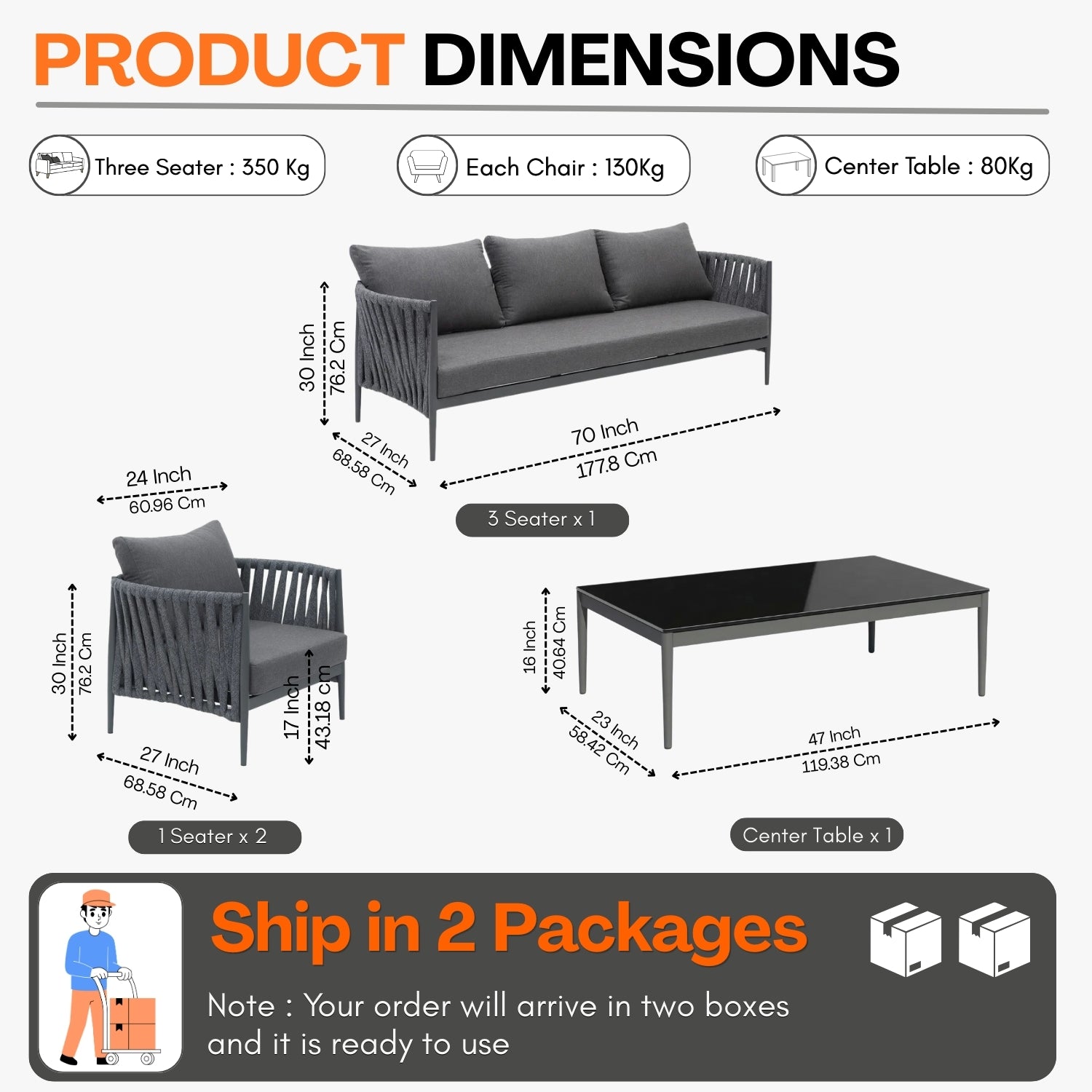 - Premium Rope Weaving with Strong Frame : The chairs and sofa feature elegant vertical rope weaving supported by a sturdy powder-coated metal frame. This combination not only adds a modern designer look but also ensures excellent strength, stability, and long-lasting outdoor performance.