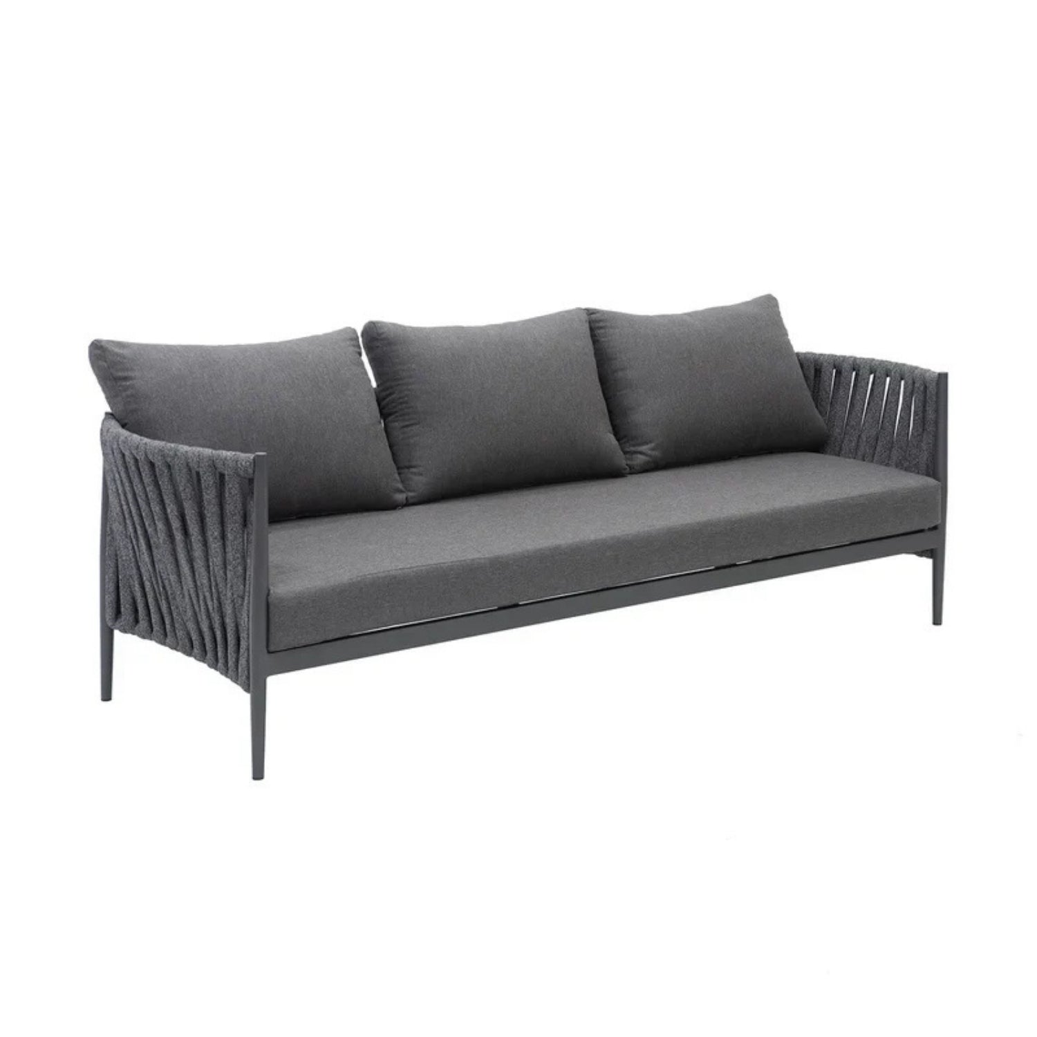 Upgrade your outdoor living space with this elegant 5-seater patio sofa set, designed to bring comfort, style, and durability together. Featuring a modern rope-woven design and a strong powder-coated metal frame, this set offers excellent stability while maintaining a sleek, contemporary look. The spacious three-seater sofa and two comfortable single chairs provide ample seating for family and guests, making it perfect for relaxing conversations, evening gatherings, or peaceful moments outdoors. The thick, soft cushions are crafted for long-lasting comfort and are ideal for extended seating, while the breathable fabric helps keep the seating cool and pleasant. At the center, a sturdy coffee table provides a convenient surface for drinks, snacks, or decorative items, completing the set’s functional design.Built with weather-resistant materials, this patio furniture set is suitable for gardens, balconies, terraces, poolside areas, and patios. The combination of durable construction and timeless design ensures it remains a beautiful and reliable addition to your outdoor space for years to come. Perfect for both casual relaxation and stylish entertaining, this 5-seater set transforms any outdoor area into a comfortable and inviting retreat.