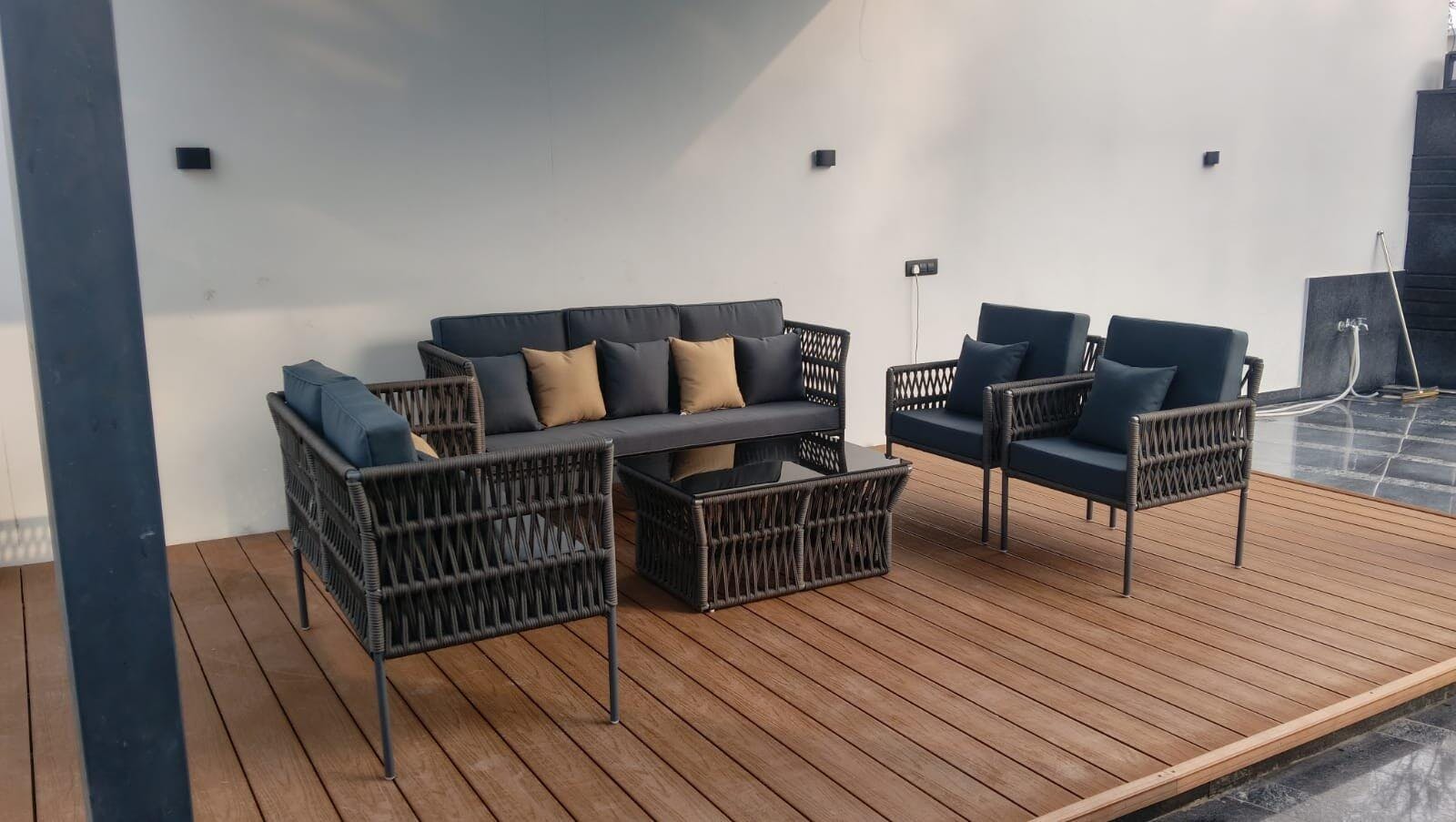 Transform your outdoor living area into a stylish and relaxing retreat with this Outdoor Rope 7-Seater Sofa Set with Glass Top Table. Thoughtfully designed for gardens, decks, lawns, and poolside spaces, this set combines durability, comfort, and modern aesthetics. The set includes a spacious 3-seater sofa, a 2-seater sofa, and two single-seater chairs, accompanied by a sturdy glass-top center table. Each piece is handwoven with all-weather weather proof rope, supported by a rust-resistant powder-coated metal frame that ensures long-lasting strength and stability. Designed for maximum comfort, the sofas and chairs come with thick, soft cushions that are water-resistant and feature removable, washable covers for easy maintenance. The ergonomic backrests and armrests provide excellent support, while the wide seating area allows you and your guests to relax comfortably. The modern rope weave not only adds a luxurious texture but also enhances breathability, keeping the seating cool even in warm weather. With its timeless design and versatile layout, this set easily adapts to different outdoor décors, making it an ideal choice for family gatherings, lounging, or entertaining guests by the pool.