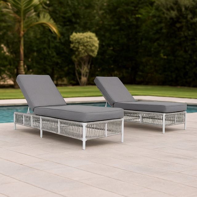 Elevate your outdoor relaxation with this stylish Set of 2 Outdoor Rope Lounge Chairs, crafted for both comfort and durability. Featuring a modern rope weave design and thick, plush cushions, these chairs offer luxurious support whether you're lounging by the pool, on the balcony, or at the beach. Built with a strong powder-coated metal frame and UV-resistant rope, this patio furniture set is designed to withstand all weather conditions—resisting fading, moisture, and rust. The breathable rope design enhances airflow for cool seating, while the water-resistant cushions with removable covers ensure easy maintenance and long-lasting use. With a lightweight yet sturdy construction, these chairs are easy to move and rearrange to suit any outdoor space. Their elegant look blends seamlessly with any décor, offering a perfect balance of style and functionality for modern outdoor living.