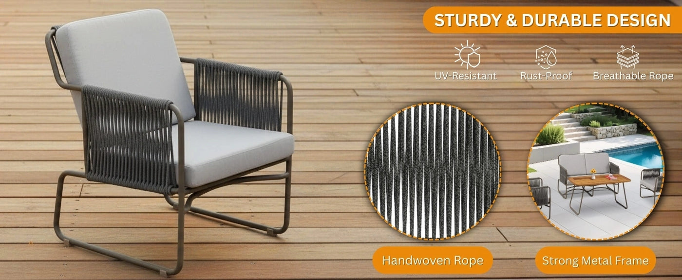 • Premium Material Quality : Made with all-weather weather proof rope and paired with a wooden top coffee table, the set combines elegance with functionality. The rope material is UV-resistant, fade-proof, and designed to withstand exposure to outdoor conditions without sagging or losing shape.