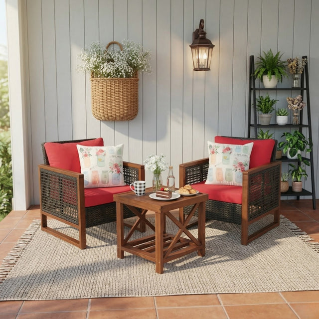 Outdoor Wicker 3-Piece Patio Furniture Set with Solid Wooden Frames (Dark Brown & Red)