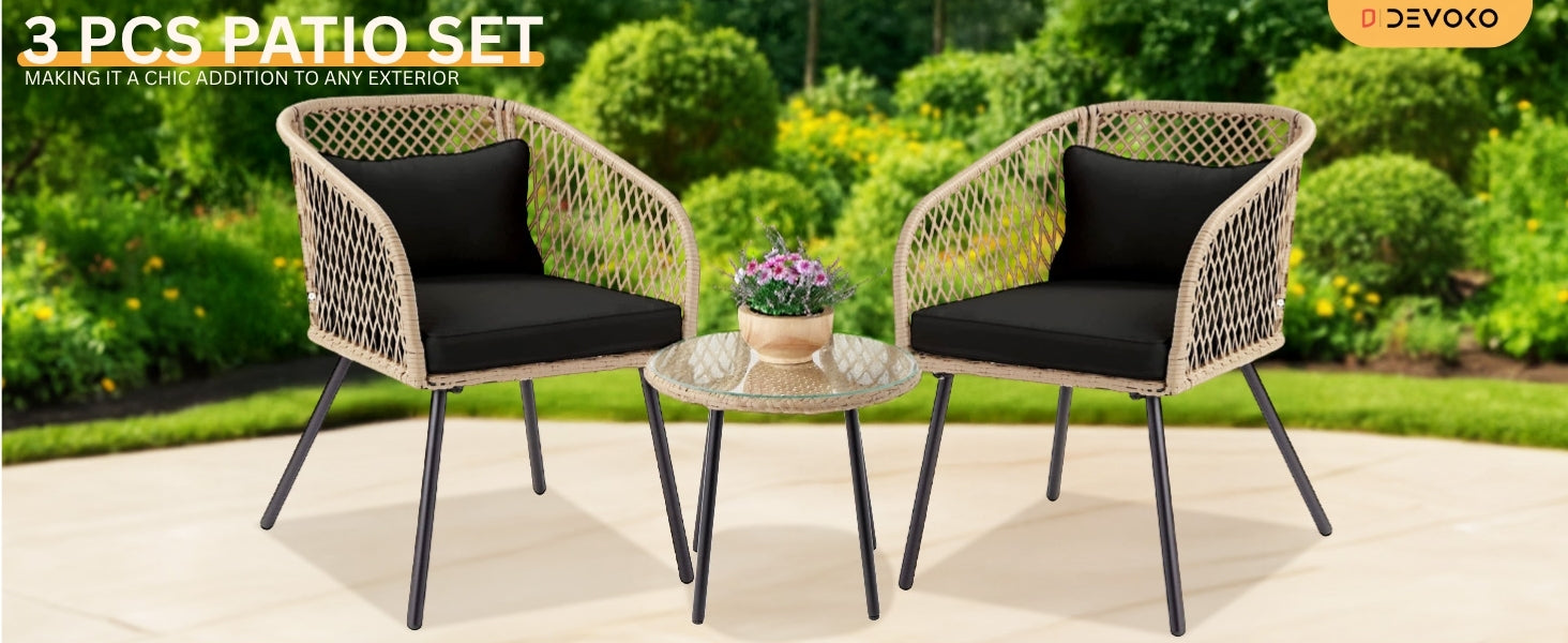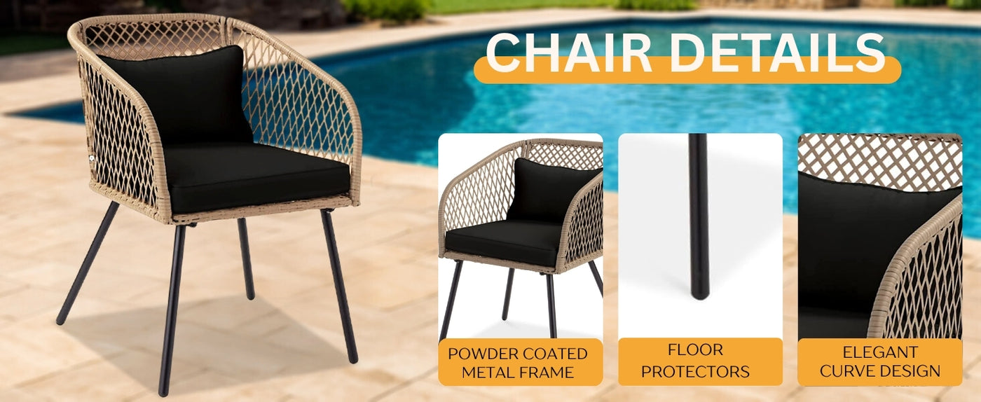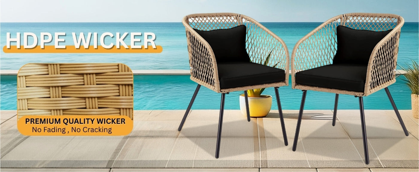 • All-Weather Rattan Wicker : Crafted with premium handwoven synthetic rattan, this patio set resists UV rays, moisture, and fading perfect for enduring the elements on your garden, balcony, poolside, or lawn.