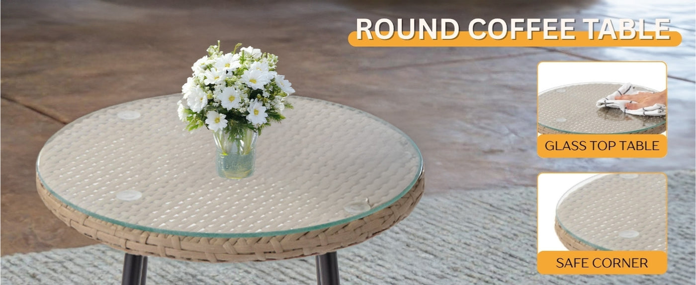 • Glass Top Table with Anti-Slip Design : The sleek and modern coffee table features a strong glass top scratch-resistant, easy to clean, and secured with suction cups for added stability during outdoor use.