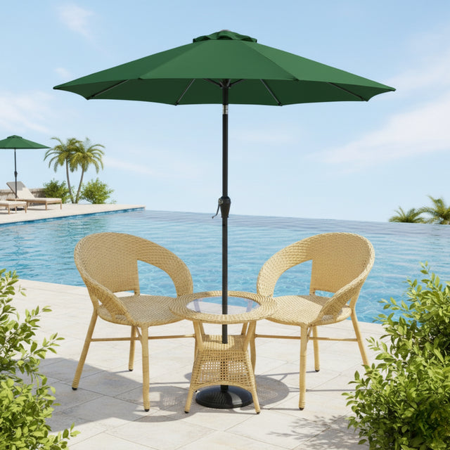 Create a cozy and stylish outdoor retreat with this 3-Piece Outdoor Wicker Patio Set with Glass Top Table and Outdoor Umbrella. Designed to enhance your garden, balcony, deck, lawn, porch, or poolside, this elegant patio furniture set combines comfort, durability, and modern design to elevate your outdoor living experience. Crafted with high-quality, handwoven all-weather HDPE wicker, this outdoor wicker patio set is built to withstand sun exposure, light rain, and daily outdoor use. The strong powder-coated metal frame provides excellent stability and rust resistance, ensuring long-lasting performance in every season. The chairs are ergonomically designed with supportive backrests and comfortable armrests, allowing you to relax for hours while enjoying fresh air and good company. The sleek glass top center table adds a sophisticated touch while offering practical functionality. Its smooth, easy-to-clean surface is perfect for serving drinks, snacks, or placing decorative items. Whether you're hosting guests or enjoying a quiet cup of coffee, the table keeps everything within easy reach. The included outdoor umbrella provides reliable shade and protection from harsh sunlight, making it ideal for warm summer days. It helps create a cool and comfortable seating area so you can fully enjoy your outdoor space without worrying about direct sun exposure. Compact yet spacious, this 3-piece patio conversation set is perfect for both small balconies and larger outdoor areas. Lightweight for easy rearrangement yet sturdy for daily use, it offers versatility and convenience. Upgrade your outdoor décor with this durable and stylish wicker patio furniture set designed to bring comfort, beauty, and functionality to your outdoor lifestyle.