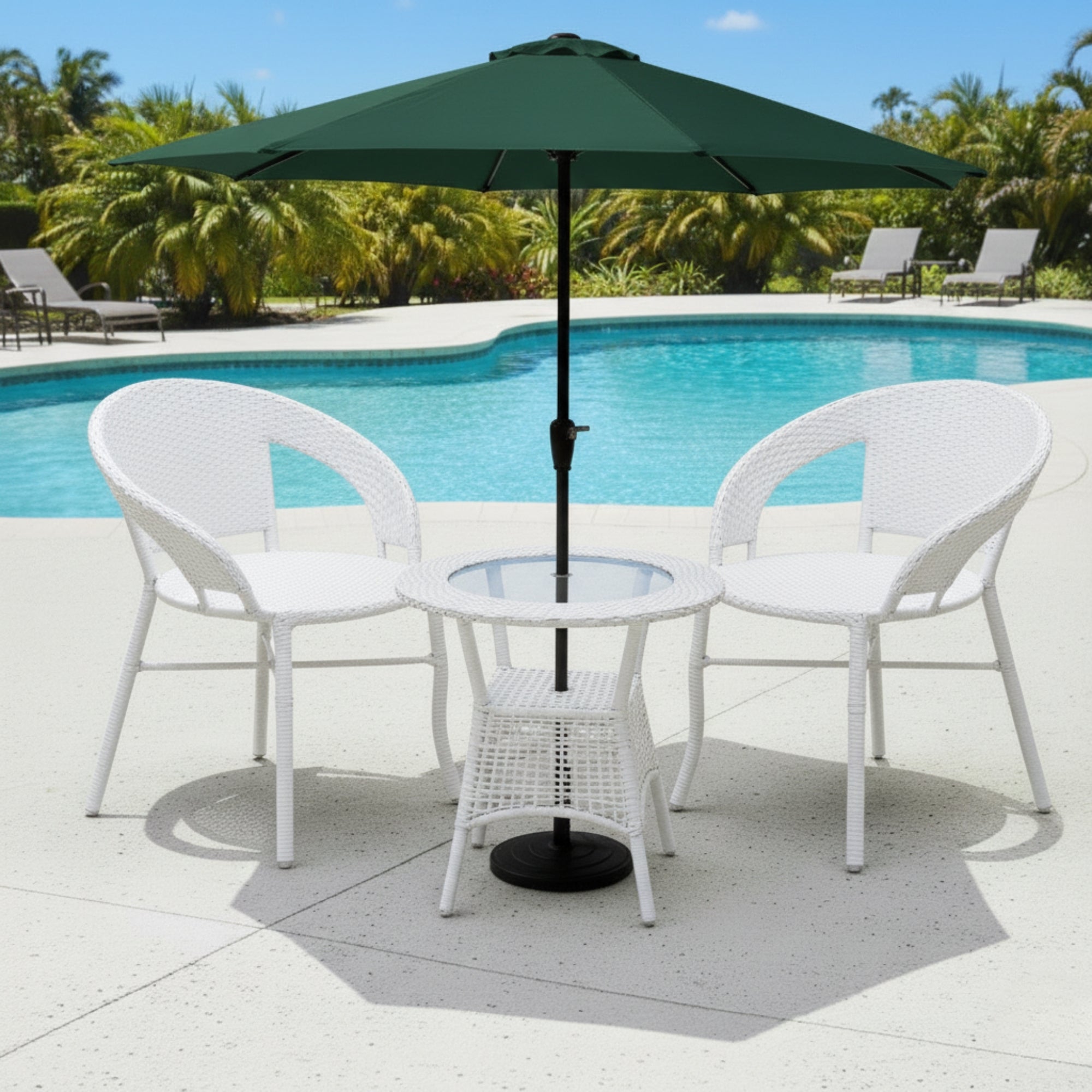 Create a cozy and stylish outdoor retreat with this 3-Piece Outdoor Wicker Patio Set with Glass Top Table and Outdoor Umbrella. Designed to enhance your garden, balcony, deck, lawn, porch, or poolside, this elegant patio furniture set combines comfort, durability, and modern design to elevate your outdoor living experience. Crafted with high-quality, handwoven all-weather HDPE wicker, this outdoor wicker patio set is built to withstand sun exposure, light rain, and daily outdoor use. The strong powder-coated metal frame provides excellent stability and rust resistance, ensuring long-lasting performance in every season. The chairs are ergonomically designed with supportive backrests and comfortable armrests, allowing you to relax for hours while enjoying fresh air and good company. The sleek glass top center table adds a sophisticated touch while offering practical functionality. Its smooth, easy-to-clean surface is perfect for serving drinks, snacks, or placing decorative items. Whether you're hosting guests or enjoying a quiet cup of coffee, the table keeps everything within easy reach. The included outdoor umbrella provides reliable shade and protection from harsh sunlight, making it ideal for warm summer days. It helps create a cool and comfortable seating area so you can fully enjoy your outdoor space without worrying about direct sun exposure. Compact yet spacious, this 3-piece patio conversation set is perfect for both small balconies and larger outdoor areas. Lightweight for easy rearrangement yet sturdy for daily use, it offers versatility and convenience. Upgrade your outdoor décor with this durable and stylish wicker patio furniture set designed to bring comfort, beauty, and functionality to your outdoor lifestyle.