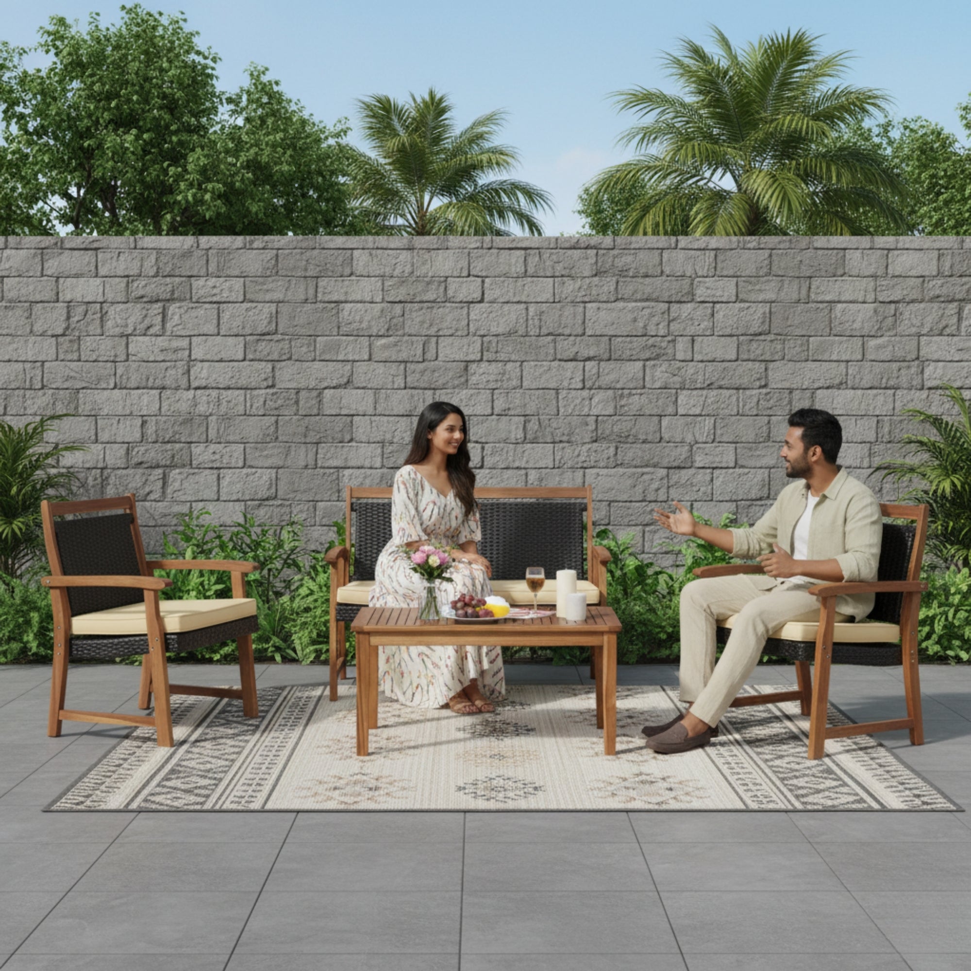 Enhance your outdoor living space with this Outdoor Wicker 4-Piece Sofa Set with Solid Sheesham Wood Frame, designed for both style and durability. Crafted with handwoven all-weather wicker, this elegant seating set offers long-lasting performance against sun and moisture. The sturdy solid wood frame adds natural strength, rich texture, and a premium finish, ensuring stability and timeless appeal. Perfect for gardens, balconies, patios, and terraces, the set includes comfortable seating that creates a warm and inviting atmosphere for family gatherings or relaxed evenings. Thick, high-density foam cushions provide deep seating comfort with excellent shape retention, making your outdoor lounging experience soft, supportive, and relaxing for long hours. Its modern yet rustic design blends beautifully with contemporary and traditional outdoor décor. Strong, durable, and visually refined, this 4-piece sofa set is an ideal choice for luxurious outdoor comfort.