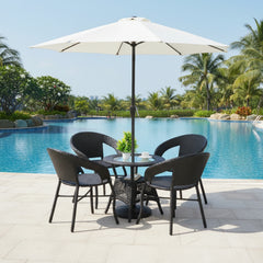 Transform your outdoor space into a stylish and comfortable retreat with this premium Outdoor Wicker 5-Piece Patio Set with Outdoor Umbrella. Crafted with durable all-weather HDPE wicker and supported by a sturdy powder-coated metal frame, this set is designed to withstand sun, rain, and everyday outdoor use while maintaining its elegant look. The set includes four generously sized chairs with plush, high-density cushions that offer exceptional comfort and support perfect for relaxing with family and friends or enjoying lazy afternoons in the fresh air. At the center, a sleek glass-top coffee table provides a stable surface for drinks, snacks, and décor, making it ideal for entertaining guests or holding outdoor essentials. The included large outdoor umbrella adds shade and protection from harsh sunlight, allowing you to enjoy your patio in comfort throughout the day. With its combination of comfort, durability, and timeless design, this 5-piece patio set creates an inviting outdoor environment that enhances any garden, patio, deck, or backyard. Whether you’re hosting gatherings or simply unwinding after a long day, this outdoor wicker patio set delivers both style and function for memorable outdoor moments.