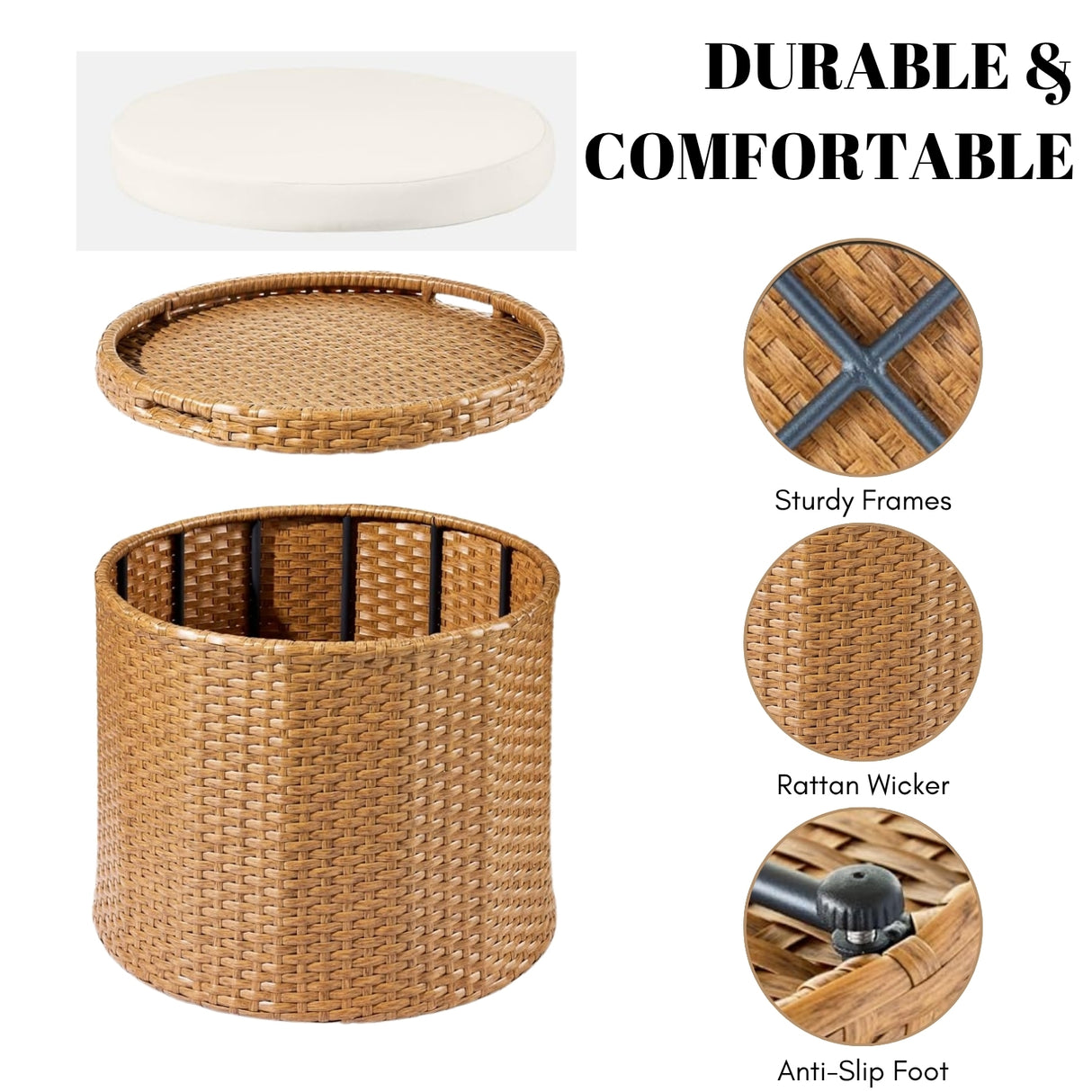 Elevate your outdoor living with this beautifully handwoven round wicker ottoman – a perfect blend of style, comfort, and functionality. Designed for patios, backyards, balconies, and garden spaces, this multipurpose ottoman is more than just a decorative accent it’s a smart, space-saving addition to any outdoor setup. Crafted with all-weather PE rattan over a strong powder-coated metal frame, this round ottoman offers year-round durability, resisting UV rays, moisture, and rust. The woven texture adds a touch of natural elegance, while the neutral tones easily complement various outdoor furniture styles. The cushioned top, made with water-resistant fabric, provides exceptional comfort and is removable for easy cleaning and storage. Beneath the cushioned seat lies a hidden storage compartment, perfect for tucking away outdoor essentials like throws, cushions, magazines, or small garden tools. Use it as a comfortable extra seat during gatherings, a cozy footrest while lounging, or a convenient side table by simply removing the cushion and placing a tray on top. This round wicker ottoman adapts to your needs with ease, making it an ideal multifunctional companion for compact or expansive outdoor spaces.