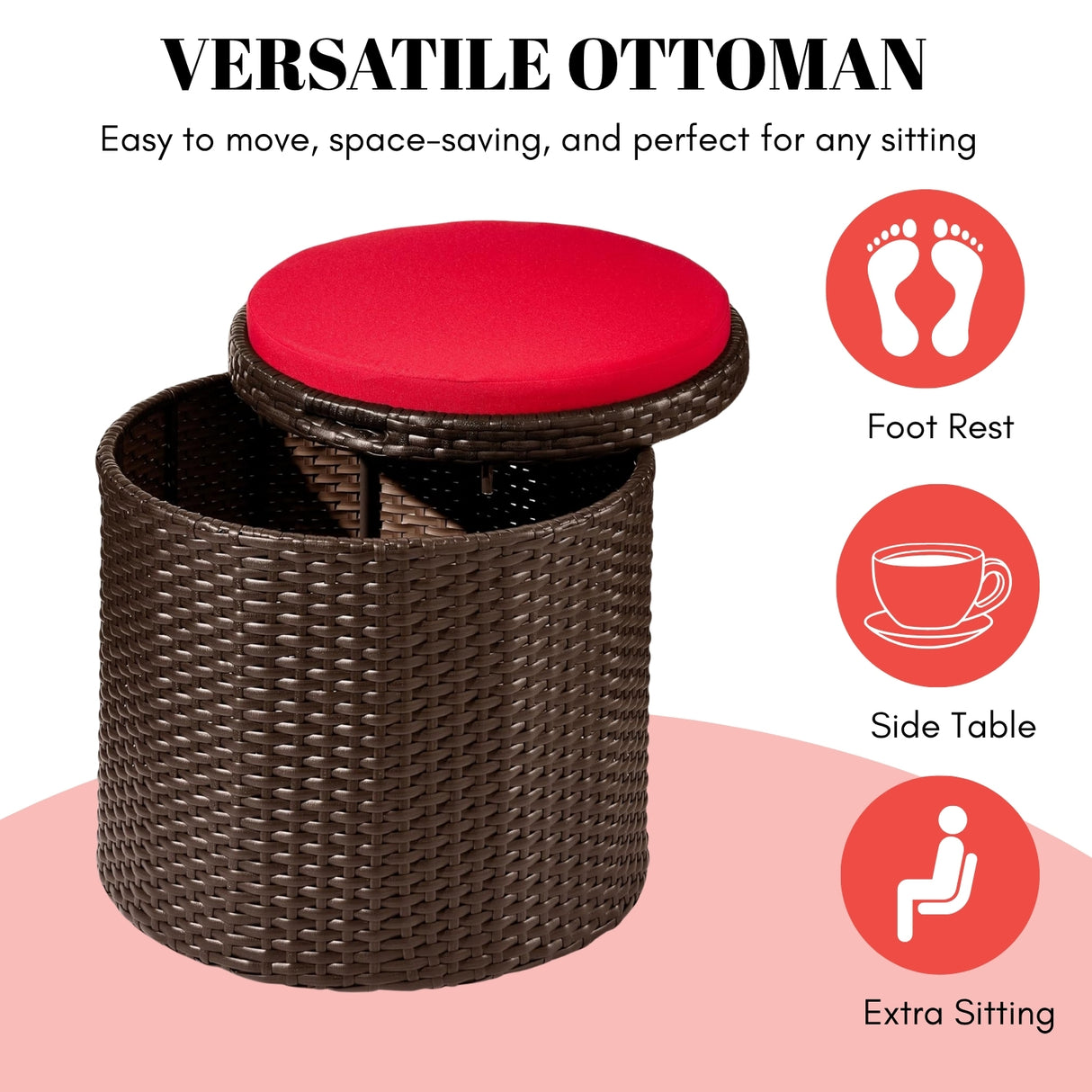 Elevate your outdoor living with this beautifully handwoven round wicker ottoman a perfect blend of style, comfort, and functionality. Designed for patios, backyards, balconies, and garden spaces, this multipurpose ottoman is more than just a decorative accent it’s a smart, space-saving addition to any outdoor setup. Crafted with all-weather PE rattan over a strong powder-coated metal frame, this round ottoman offers year-round durability, resisting UV rays, moisture, and rust. The woven texture adds a touch of natural elegance, while the neutral tones easily complement various outdoor furniture styles. The cushioned top, made with water-resistant fabric, provides exceptional comfort and is removable for easy cleaning and storage. Beneath the cushioned seat lies a hidden storage compartment, perfect for tucking away outdoor essentials like throws, cushions, magazines, or small garden tools. Use it as a comfortable extra seat during gatherings, a cozy footrest while lounging, or a convenient side table by simply removing the cushion and placing a tray on top. This round wicker ottoman adapts to your needs with ease, making it an ideal multifunctional companion for compact or expansive outdoor spaces.