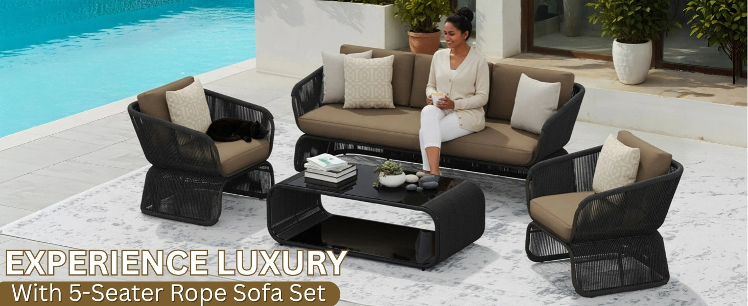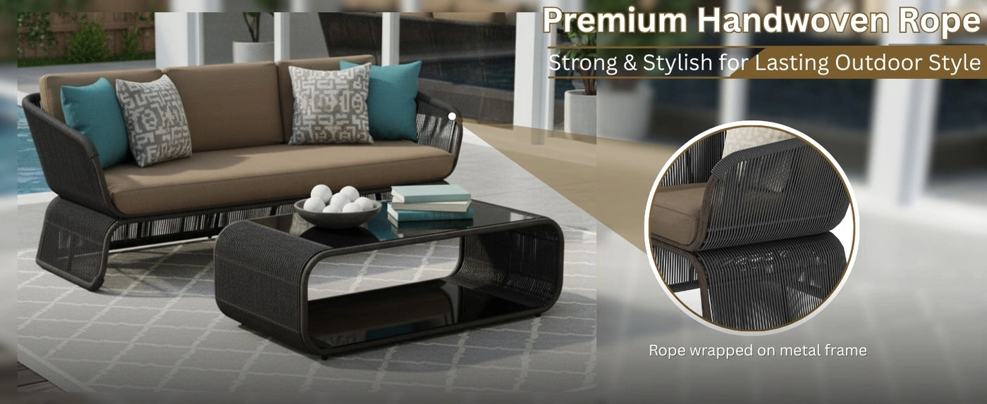 Transform your outdoor living space with this elegantly designed Braided Rope Sofa Set, crafted to bring style, comfort, and durability to your garden, patio, balcony, or poolside. The set includes a spacious 3-seater sofa, two single-seater chairs, and a 2-tier center table with a glass top, offering both functionality and aesthetic appeal. Built with handwoven braided rope on a rust-resistant powder-coated metal frame, this set ensures long-lasting performance against varying weather conditions. The woven rope not only adds a modern, breathable texture but also provides ergonomic support for comfortable lounging. Plush, removable cushions with water-resistant covers enhance seating comfort while making cleaning and maintenance hassle-free. The 2-tier coffee table combines sturdy rope weaving with a glass top for a sleek, stable surface ideal for serving drinks, snacks, or displaying décor. Its lower shelf provides extra space for storage or convenience. Designed for all-weather durability and timeless style, this sofa set makes a versatile addition to any outdoor setting, whether for family gatherings, entertaining guests, or simply enjoying leisure time outdoors.