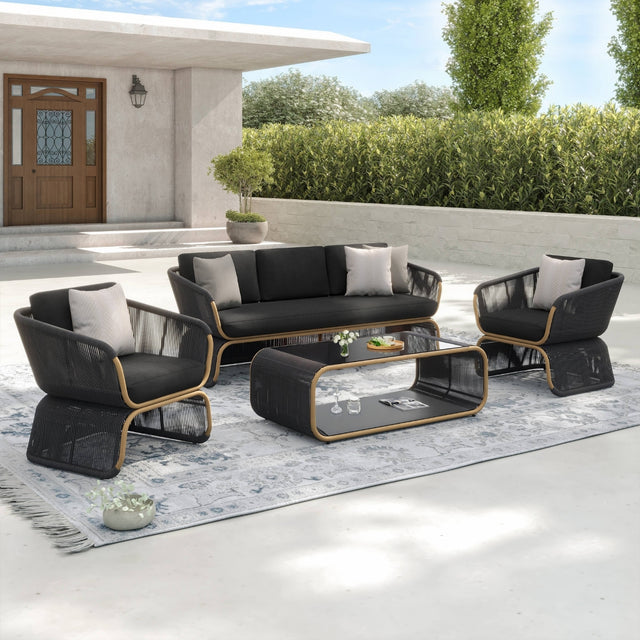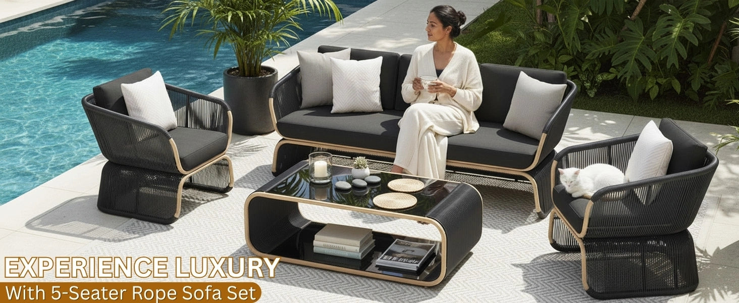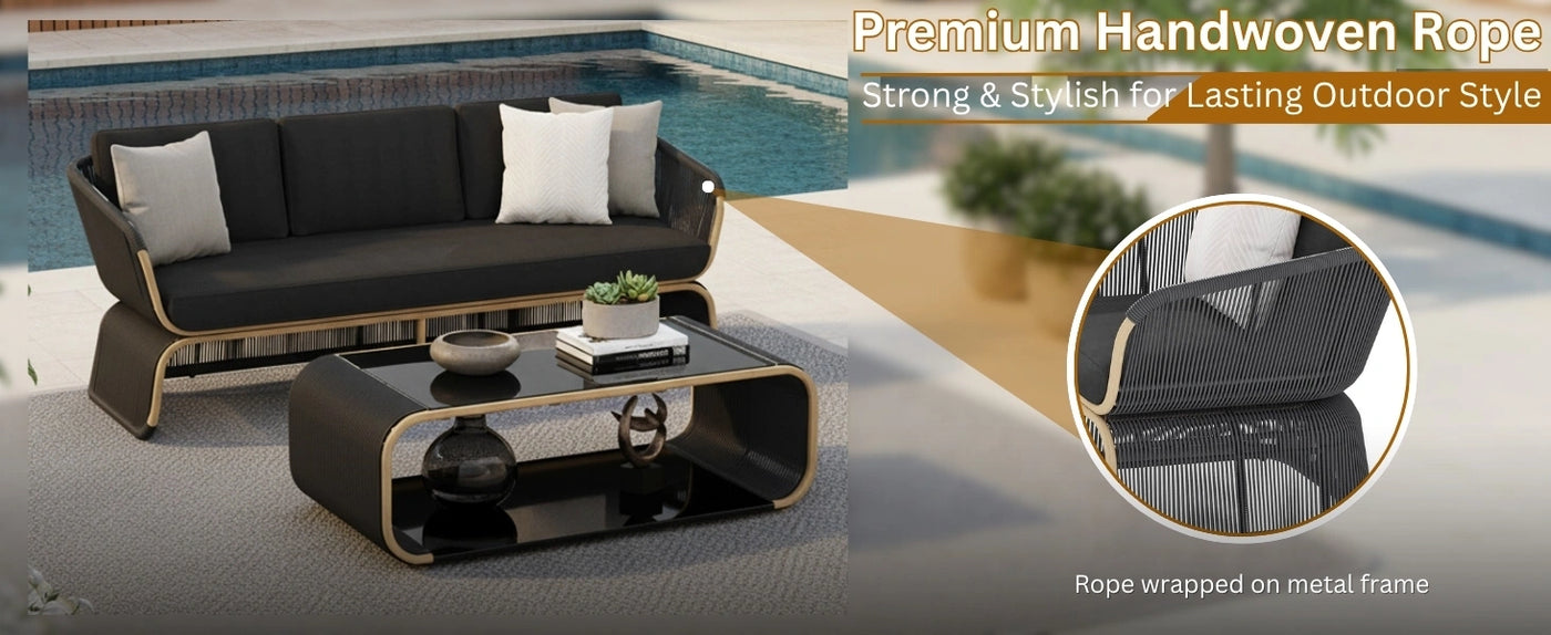 Transform your outdoor living space with this elegantly designed Braided Rope Sofa Set, crafted to bring style, comfort, and durability to your garden, patio, balcony, or poolside. The set includes a spacious 3-seater sofa, two single-seater chairs, and a 2-tier center table with a glass top, offering both functionality and aesthetic appeal. Built with handwoven braided rope on a rust-resistant powder-coated metal frame, this set ensures long-lasting performance against varying weather conditions. The woven rope not only adds a modern, breathable texture but also provides ergonomic support for comfortable lounging. Plush, removable cushions with water-resistant covers enhance seating comfort while making cleaning and maintenance hassle-free. The 2-tier coffee table combines sturdy rope weaving with a glass top for a sleek, stable surface—ideal for serving drinks, snacks, or displaying décor. Its lower shelf provides extra space for storage or convenience. Designed for all-weather durability and timeless style, this sofa set makes a versatile addition to any outdoor setting, whether for family gatherings, entertaining guests, or simply enjoying leisure time outdoors.
